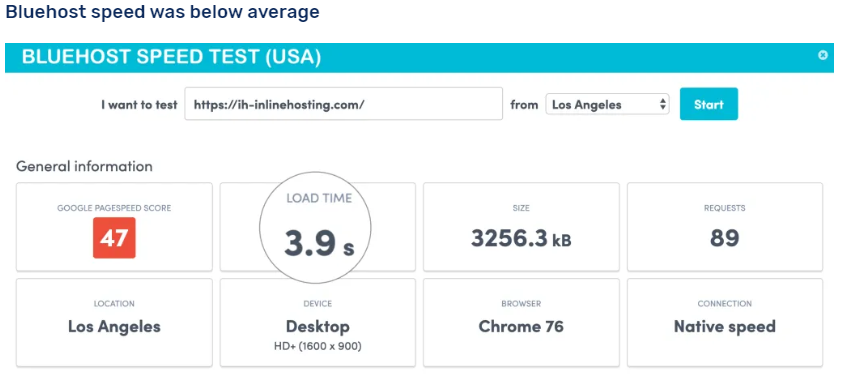 A speed test by actually hosting an identical web page with the same theme, content and size on both HostGator and Bluehost. We calculated its load time from the USA. Here are the test results.